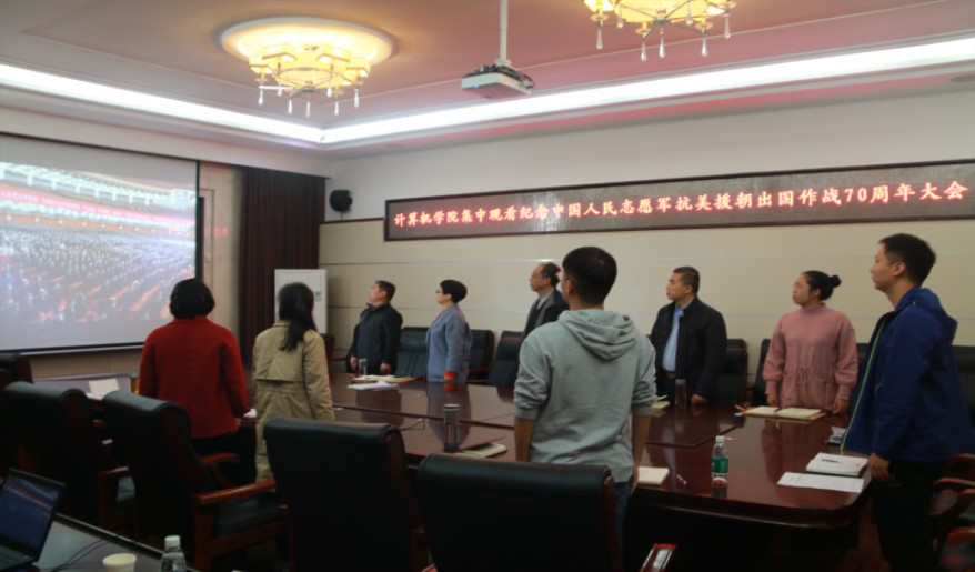 上午10时,大会开始。学院观看师生全体起立,高唱国歌。国歌唱毕,全场肃立,向在抗美援朝战争中英勇牺牲的烈士默哀。在纪念抗美援朝出国作战70周年大会上,习近平总书记指出,70年前,由中华优秀儿女组成的中国人民志愿军,雄赳赳、气昂昂,跨过鸭绿江,同朝鲜人民和军队一道,浴血奋战,赢得了抗美援朝战争伟大胜利。这一战,让世界见证了蕴含在中国人民之中的磅礴力量,让世界知道了“现在中国人民已经组织起来了,是惹不得的。如果惹翻了,是不好办的”!