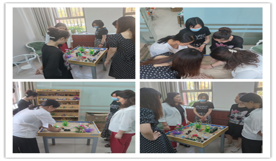 培训活动中,国家二级心理咨询师汪志英老师向参训人员介绍了本次活动的目的、沙盘操作技能等相关知识。参加培训的师生兴趣盎然,积极动手制作个体沙盘、团体沙盘,随后汪志英老师带领大家做了相关分享和分析。