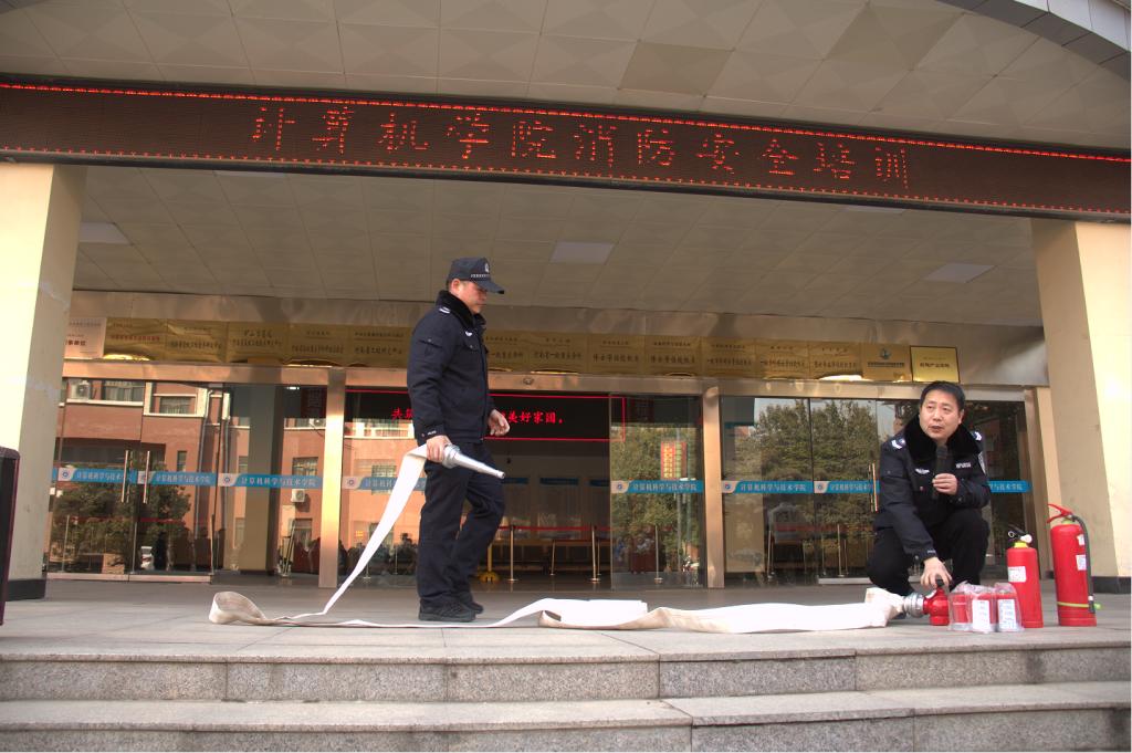 活动开始前,学院领导与保卫处沟通协调,认真细致制定演练活动方案。活动初始,学院党委副书记阎俊豪介绍演练方案和演练注意事项。接着,保卫处袁海庆现场为师生讲解了干粉灭火器、强化水型灭火器的实际操作步骤和注意事项;消防水管的连接和使用方法;火灾袭来时迅速逃生的方法等。随后,部分师生在保卫处工作人员指导下进行现场实际操作灭火演练,让师生从理论到实践身临其境地掌握消防技能。