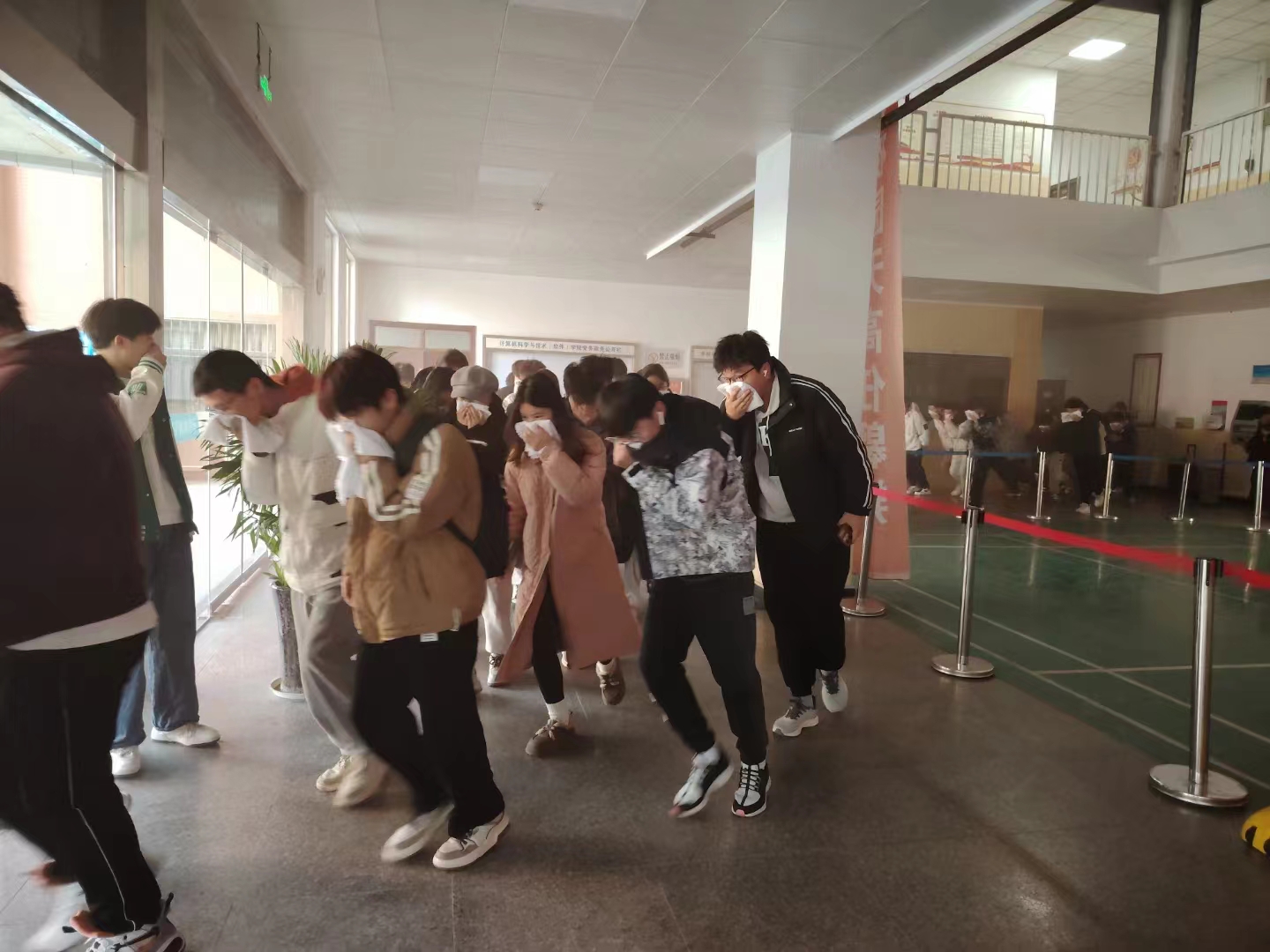 接着,师生进入教学楼进行安全疏散演练。保卫处消防员在一楼大厅点燃烟雾弹,整个学院顿时烟雾弥漫,发现火情的老师迅速呼喊并广播消防警报。听到报警后,师生在疏散老师的指引下用湿毛巾或衣袖捂住口鼻,弯腰有秩序地从教室和实验室等迅速撤离到学院大门前并清点人数。消防安全疏散演练取得圆满成功。最后,阎俊豪点评活动并宣布演练结束。