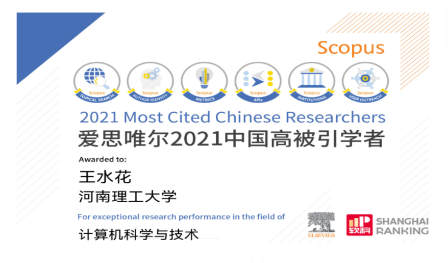 414日,爱思唯尔(Elsevier)正式发布了2021年中国高被引学者(Highly Cited Chinese Researchers)榜单,我院客座教授王水花博士以新葡的京集团350vip8888第一单位,入选计算机科学与技术学科2021“中国高被引学者”榜单。这是王水花博士第2次入选“中国高被引学者”。