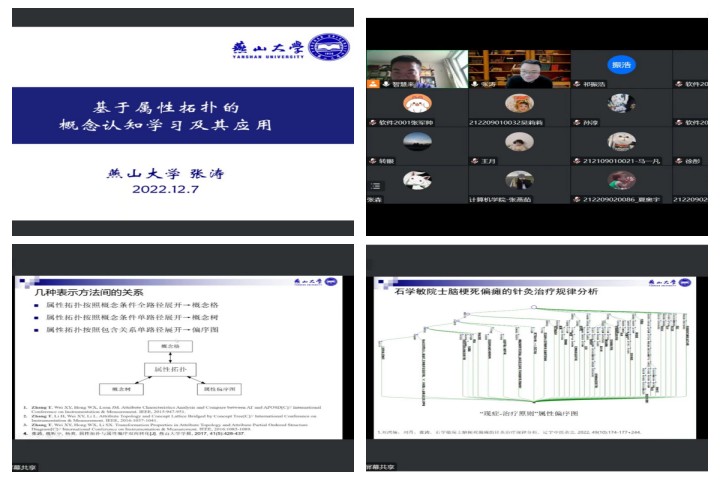 127日上午,燕山大学教授张涛应邀参加我院第三届研究生学术文化节,为我院、软件学院师生线上作了题为《基于属性拓扑的概念认知学习及其应用》的学术报告,软件学院智慧来副教授主持报告会,部分教师和研究生参加报告会。