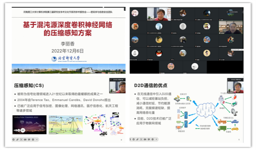 126日上午,我院有幸邀请到北京邮电大学李丽香教授参加我院第三届研究生学术文化节,为学院师生线上作题为《基于混沌源深度卷积神经网络的压缩感知方案》的学术报告,汤永利教授主持报告会,部分教师和课题组研究生参加报告会。
