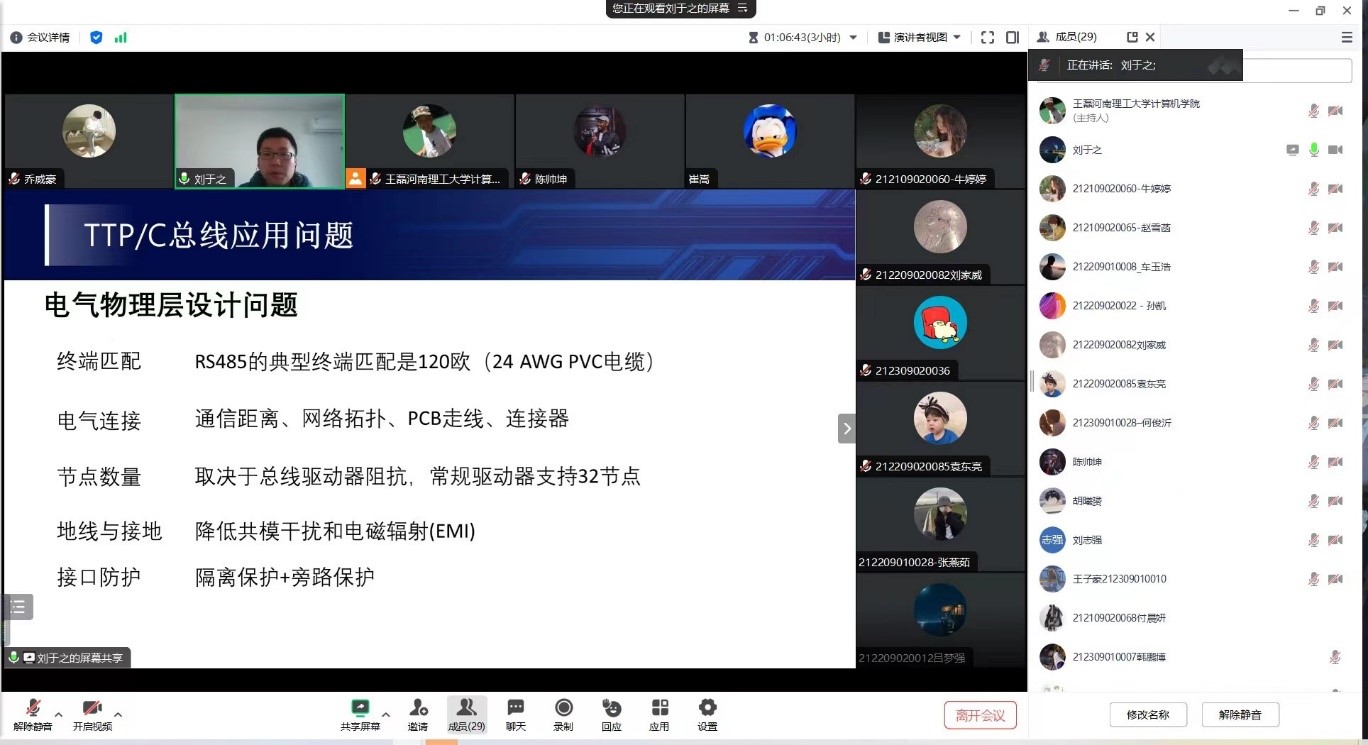 报告会上,刘于之首先讲解了航空发动机控制的发展历程、FADEC系统的组成和基本控制原理,并分析了未来航空发动机控制的发展趋势,并指出时间触发总线在新一代分布式FADEC系统中的重要性。接着介绍了时间触发总线的基本概念,在此基础上对当前航空领域应用较广的一种时间触发总线——TTP/C总线工作原理进行了深入分析;最后讲解了TTP/C总线在FADEC系统中的设计和应用情况。