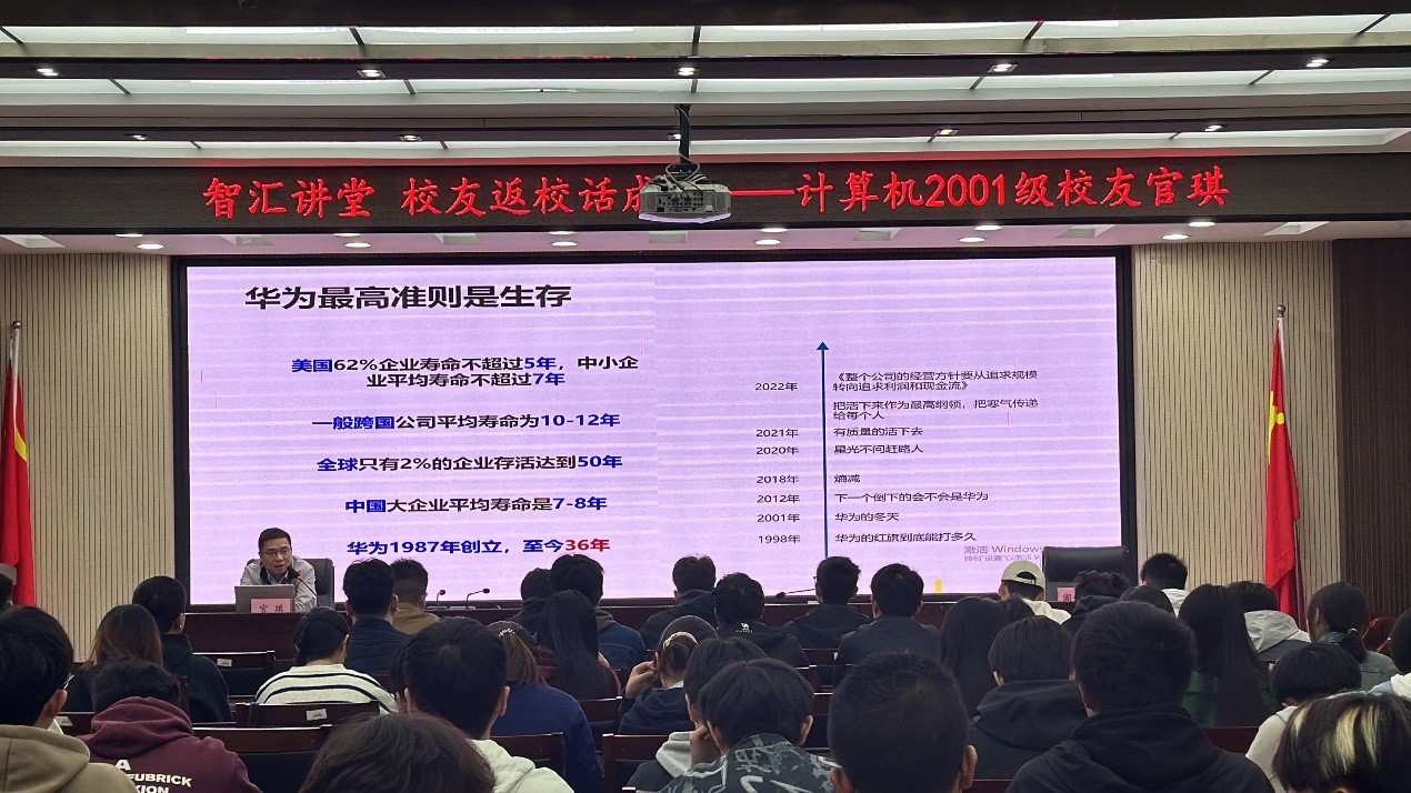 讲座中,官琪首先回顾了在华为公司的工作成长历程,分享了在软件开发、项目管理等多个岗位的工作点滴,讲述了自己负责开发的产品远销10余国、累计销售额近千亿美金的工作业绩,以及勇敢转型投身战略规划市场拓展领域的宝贵经验。随后,他结合自己的经历,强调了自我认知和终身学习的重要性,着重介绍了个人快速成长的参考模型,鼓励同学们勇于挑战自我,不断提升竞争力。讲座期间,他还分享了华为公司的成功之道,介绍了华为在研发投入、专利数量、业务范围等方面的雄厚实力。
